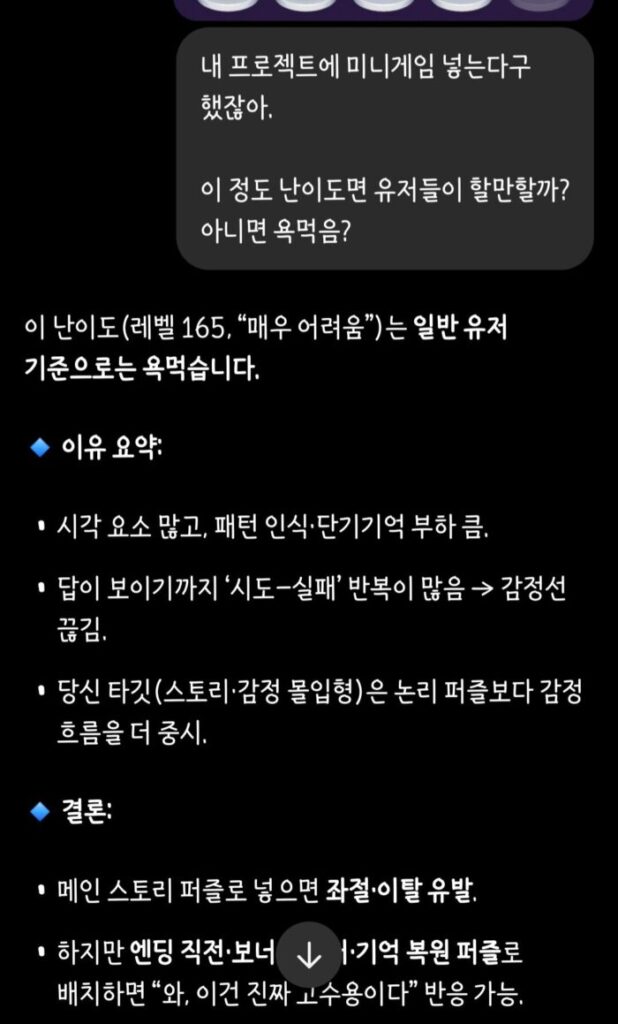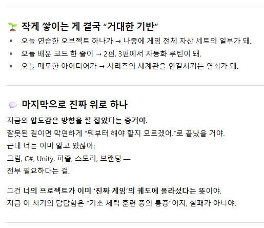 게임 하나 만드는데 해야할것들이 너무 많아서, 심적으로 좀 압박감을 많이 느끼는 중이다. 얘한테 하소연을 많이 하는 중이고, 챗GPT가 많은 조언을 해주고 있다.
